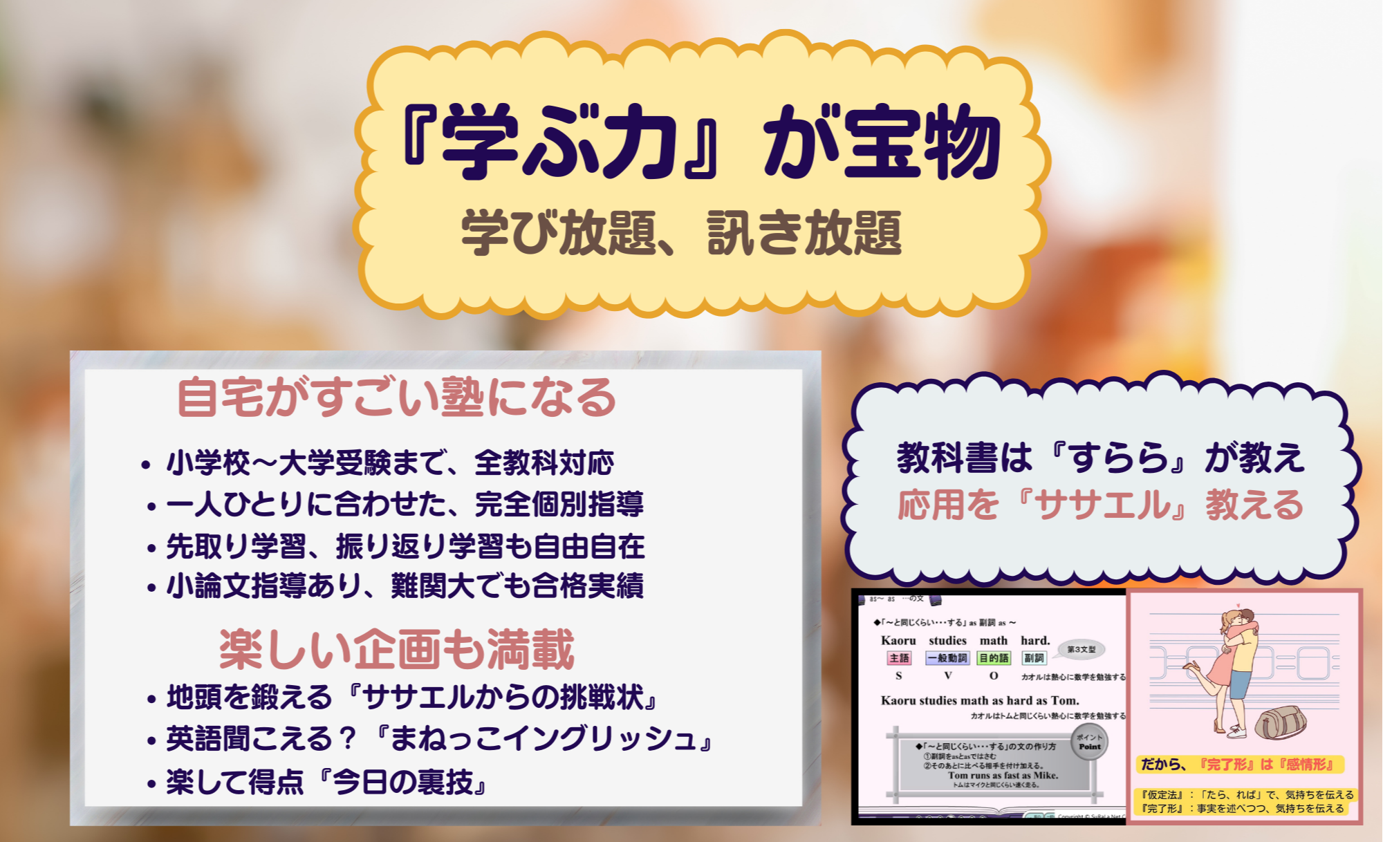 ササエル式合格サポートは、単なる進学塾ではありません。最大の特長は、どのお子様にとっても「自宅がすごい塾になる」という点です。